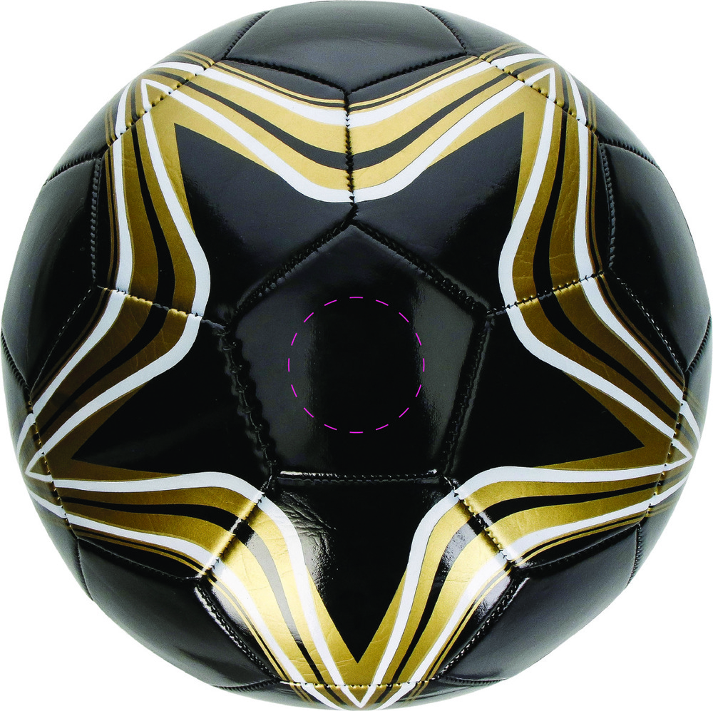 Tore schießen wie ein Champion! Maschinell genähter Fußball aus PVC in glänzendem schwarz mit aufgedruckten Sternen in gold und weiß. Größe 5. Der Ball in Größe 5 ist 3-lagig und hat 32 Panele. Er verfügt über eine Dicke von 1,6 mm, ein Butyl-Ventil und eine Latex-Blase.