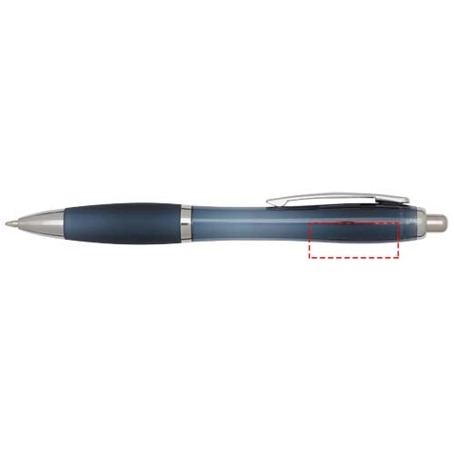 Der Nash Kugelschreiber aus recyceltem Kunststoff mit Klickmechanismus zeichnet sich durch sein stilvolles, geschwungenes Design aus. Er verfügt über einen transparenten, farbigen Schaft mit silbernen Akzenten sowie einen farblich passenden weichen Griff, der für ein angenehmes Schreibgefühl sorgt. Er besteht aus RCS-zertifiziertem recyceltem ABS Kunststoff und trägt dazu bei, den Verbrauch von Neuware zu reduzieren, ohne dabei an Strapazierfähigkeit einzubüßen. Auf der Rückseite befindet sich ein rABS-Logo, das auf den Recyclinganteil hinweist. Tintenfarbe: Schwarz. Spitzengröße: 1,0 mm. Schreiblänge: 1000 Meter.