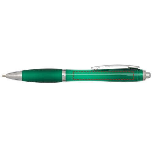 Der Nash Kugelschreiber aus recyceltem Kunststoff mit Klickmechanismus zeichnet sich durch sein stilvolles, geschwungenes Design aus. Er verfügt über einen transparenten, farbigen Schaft mit silbernen Akzenten sowie einen farblich passenden weichen Griff, der für ein angenehmes Schreibgefühl sorgt. Er besteht aus RCS-zertifiziertem recyceltem ABS Kunststoff und trägt dazu bei, den Verbrauch von Neuware zu reduzieren, ohne dabei an Strapazierfähigkeit einzubüßen. Auf der Rückseite befindet sich ein rABS-Logo, das auf den Recyclinganteil hinweist. Tintenfarbe: Schwarz. Spitzengröße: 1,0 mm. Schreiblänge: 1000 Meter.