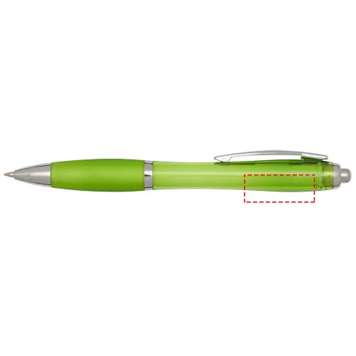 Der Nash Kugelschreiber aus recyceltem Kunststoff mit Klickmechanismus zeichnet sich durch sein stilvolles, geschwungenes Design aus. Er verfügt über einen transparenten, farbigen Schaft mit silbernen Akzenten sowie einen farblich passenden weichen Griff, der für ein angenehmes Schreibgefühl sorgt. Er besteht aus RCS-zertifiziertem recyceltem ABS Kunststoff und trägt dazu bei, den Verbrauch von Neuware zu reduzieren, ohne dabei an Strapazierfähigkeit einzubüßen. Auf der Rückseite befindet sich ein rABS-Logo, das auf den Recyclinganteil hinweist. Tintenfarbe: Schwarz. Spitzengröße: 1,0 mm. Schreiblänge: 1000 Meter.