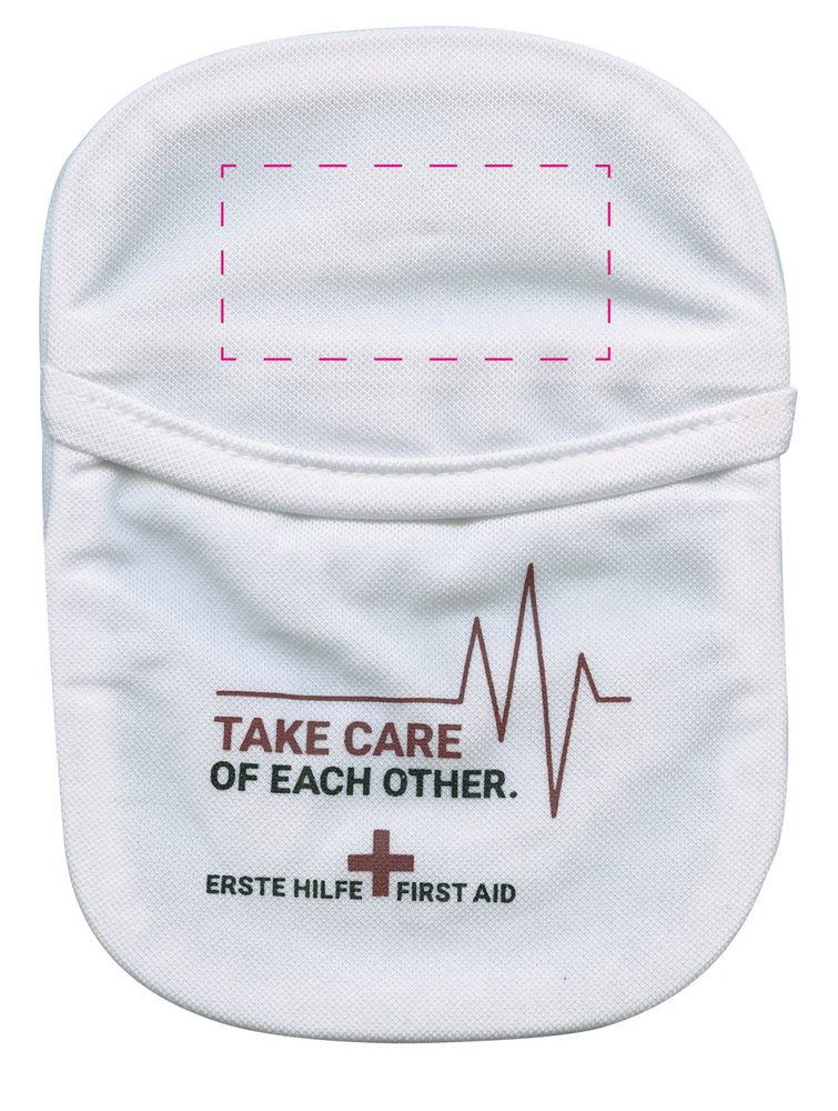 Das praktische Set ist immer zur Hand. Polyester-Tasche befüllt mit Qualitäts-Artikeln: Heftpflaster, Wundschnellverband, 2 Pflasterstrips, Verbandpäckchen, 2 Kompressen, Fixierbinde, kleiner Schere und Einmalhandschuhen.